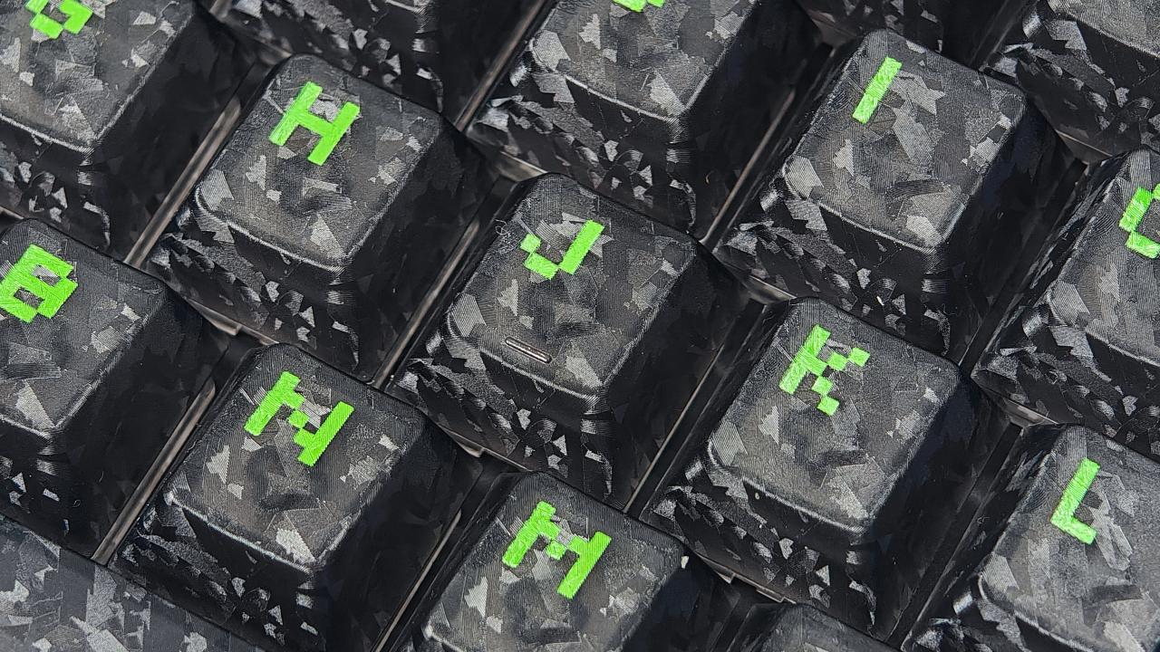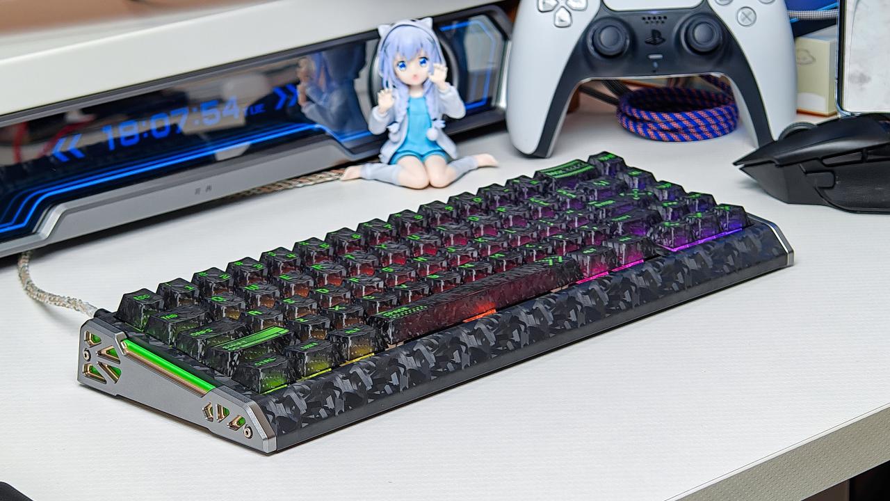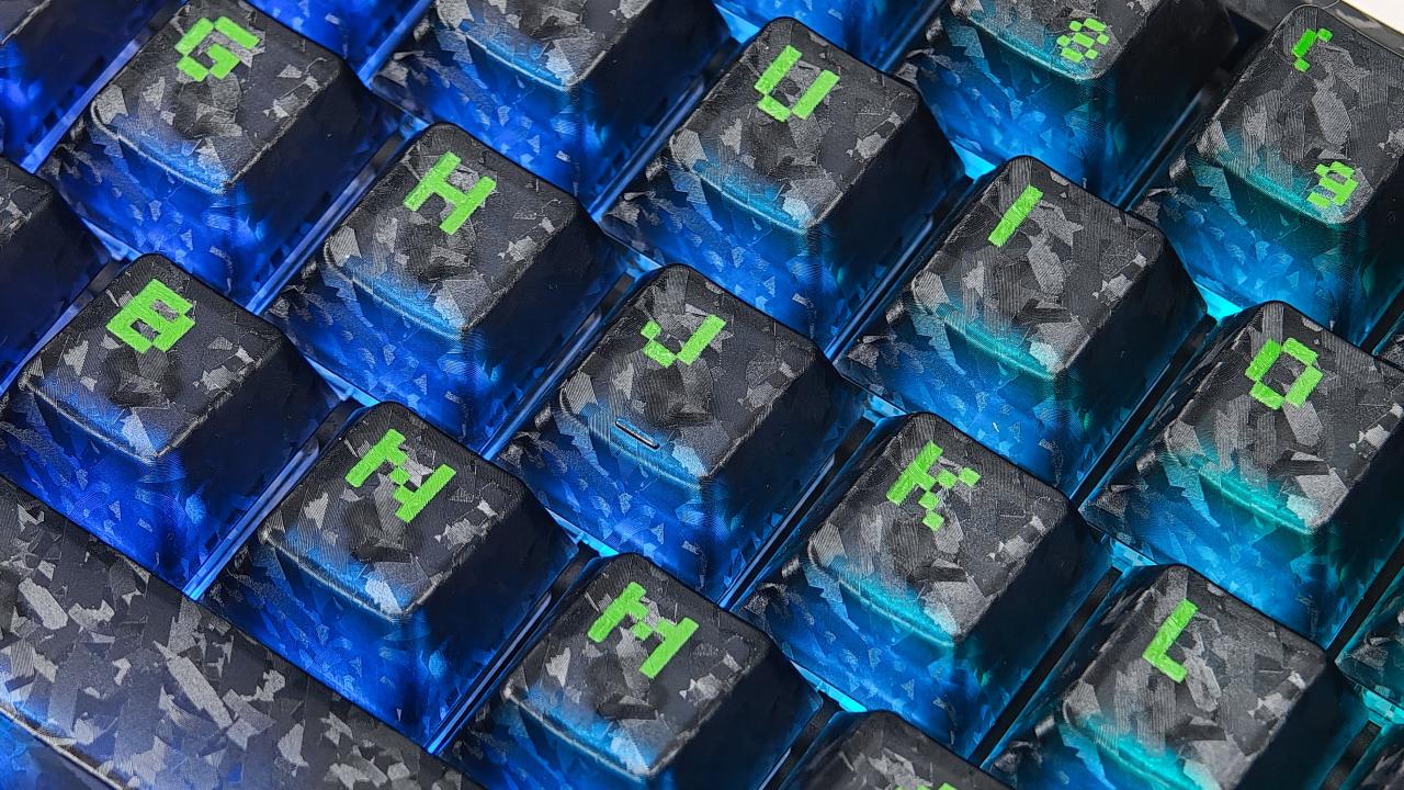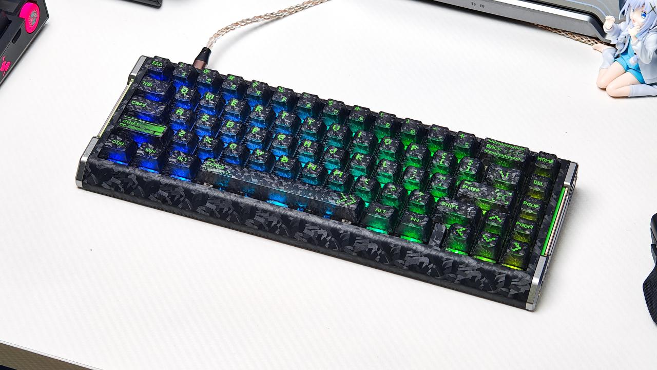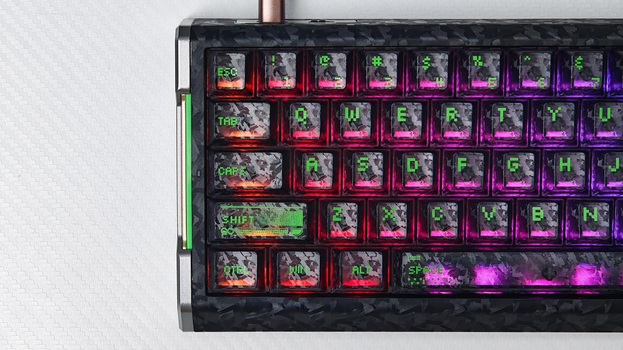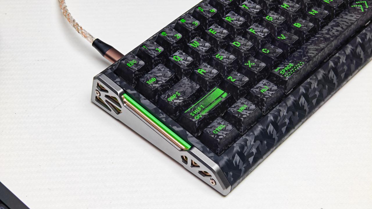 这把键盘最大的亮点就是一看过去扑面而来的碳纤维了,键帽跟外壳的锻碳纹理加上侧板的铝合金装饰件,这种搭配是真的很顶。