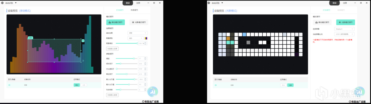 灯光方面除了基础的模式切换,还支持编辑灯效,可以随着音波或者屏幕的显示画面进行色彩映射。
