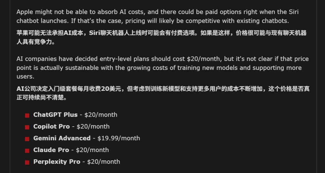 根据 MacRumors(一个知名的,报道和收集苹果相关新闻的网站)最新的分析,其戳中了一个绕不开的现实:聊天机器人不是天气预报,每一句话背后都是算力、电费和服务器。