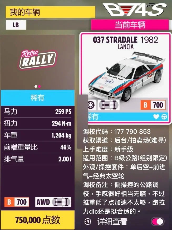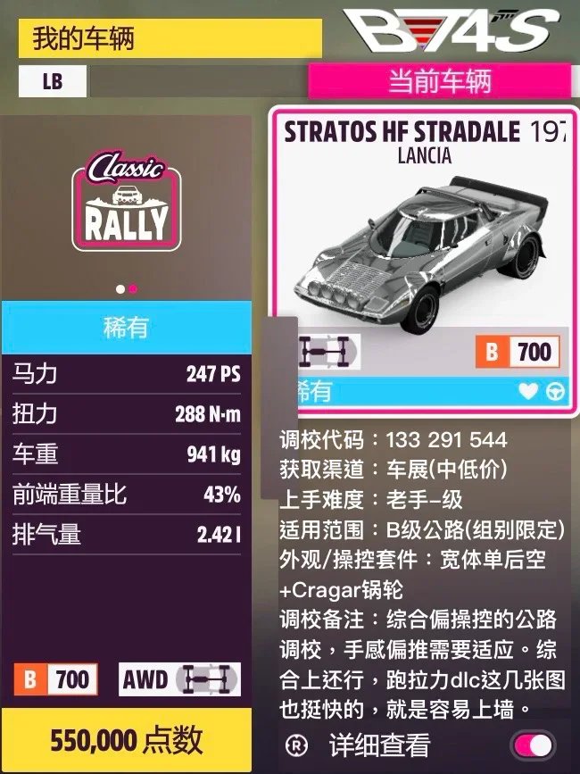 藍旗亞跑公路的話A級有強車,但B級確實是只能矮子裏拔高子了。經典的037原廠操控放B級就很超標,但推重較低,當個不快的純輪椅也還行;Stratos會更快一點,不過比較推頭容易上牆,適應了也還好。拉力DLC的公路還是操控至上的,感覺037綜合更好一點。
