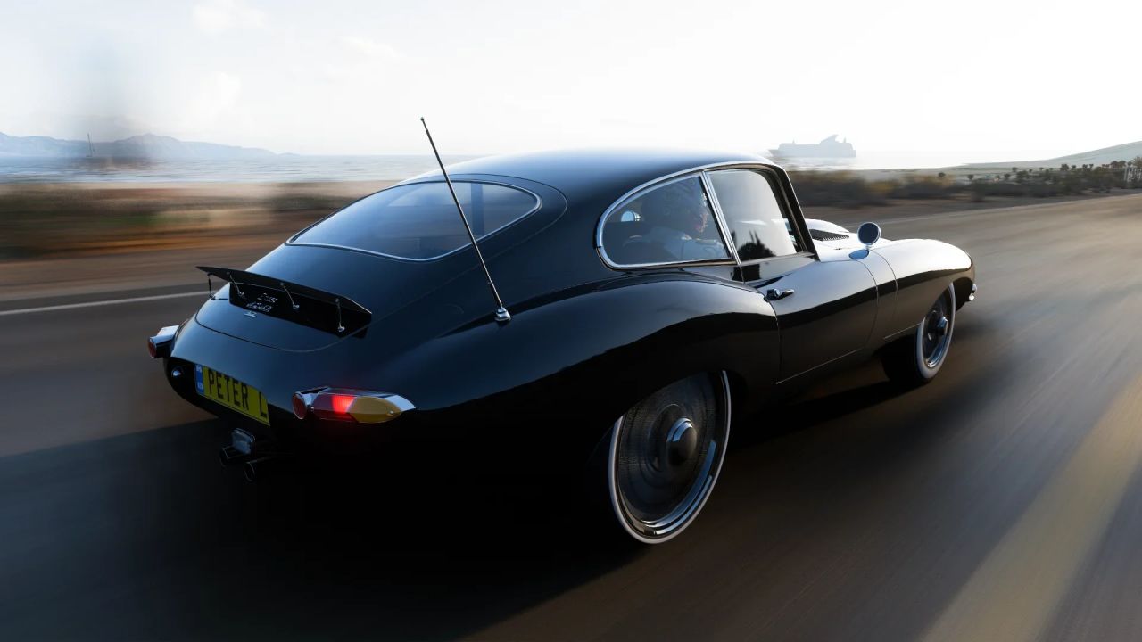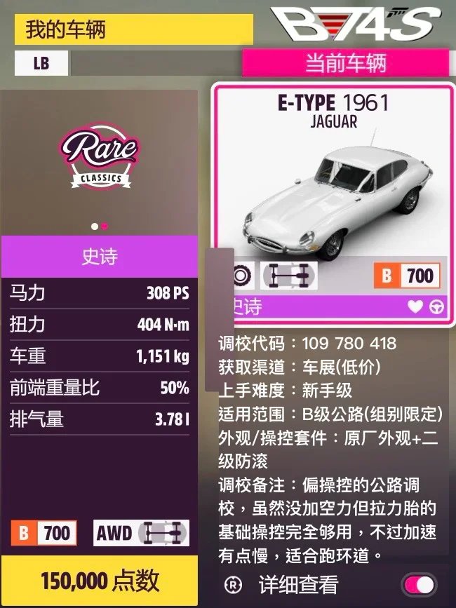 E-Type也是經典車了,確實挺漂亮的,在B級稀有經典賽車跑公路的這個組別裏也算是綜合最佳。分了兩個調校,全空懷舊胎的更快一點,也更好贏人機,無空拉力胎的操控確實好但pve反而更喫操作。下面這個珠光白不是原廠漆,不過也沒啥技術含量就不共享了。