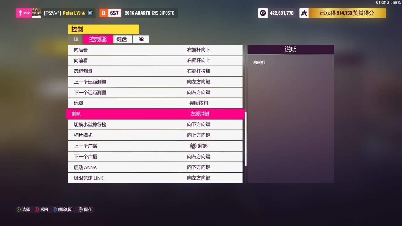 駕駛任意阿巴斯鳴喇叭5次。手柄的話建議改下鍵位,搖桿鍵按起來既費勁又有點容易傷手柄,喇叭在聯機玩的時候又挺常用的。Abarth車廠的車倒是不多,而且就在首字母排序的最前面。