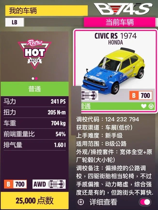 兩輛強度車,極速都不高但也用不太上極速。路虎越野車跑公路雖然怪了點但確實不錯,穩定性出色、加速迅猛,以鎖後段爲代價換取強勢的前中段還是太有性價比了。思域74則更加輪椅一點,街胎超額操控,不過加速就有點虛了,綜合還是可以的。別的車像大後Torana A9X和道奇Super Bee也不錯,這裏就不多放了。