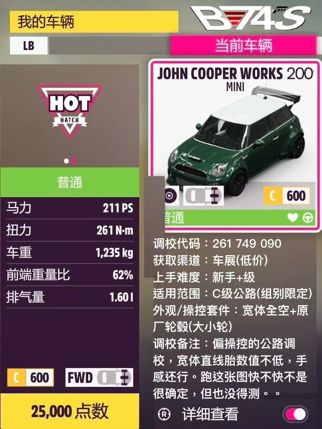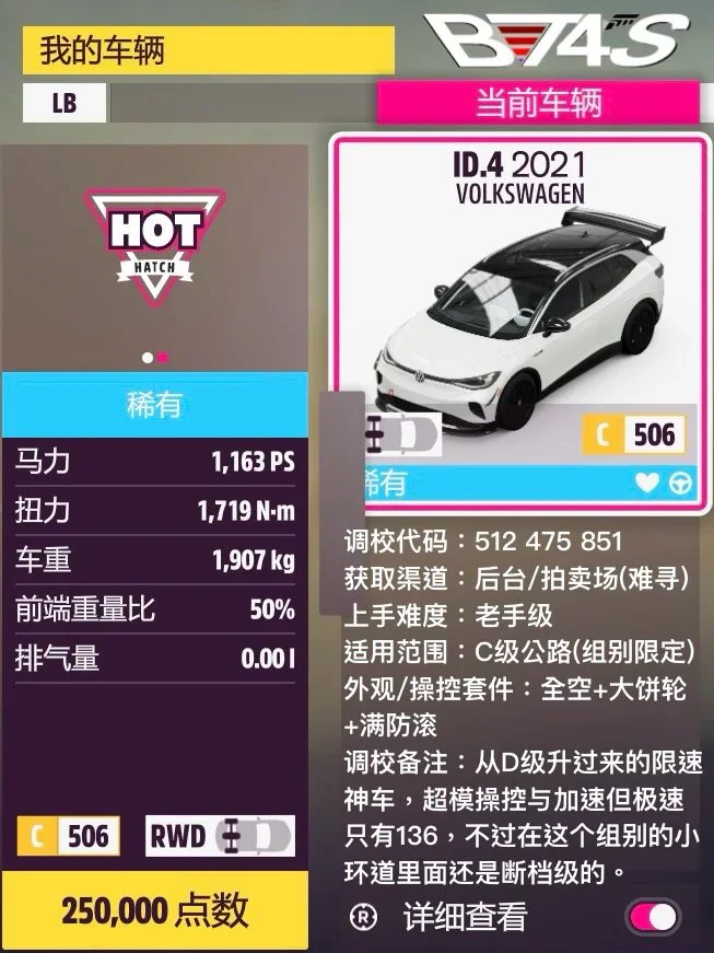 原圖限制D級所以沒法提前測了,不過推斷應該還是這倆最強。沿用了之前蛇頭的選擇,剛進後臺的ID4可以用上了,升維限速王雖然有點喫控車但還是相當輪椅的存在;mini jcw拉高了點底盤,雖然堆操控的改法不一定是最適合這張圖的但肯定是開起來最舒服的,根據上期lab的經驗還是操控更有性價比。一個是前驅直線胎一個是後驅熱熔胎,正好互補了。