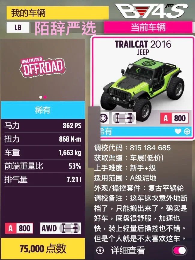 對了前面大號剛丟完一天的檔(還好調校沒丟)又調校保存數量達到上限了。所以這次也算情有可原吧,再加上這個時間點測的A無限制越野車跑爛路是之前一直不喜歡的trailcat斷檔第一,差點直接放棄不做了。所以不確定之後會選繼續在大號邊刪邊調還是換小號調還是乾脆不調了,先看看6代發佈會再做決定吧。