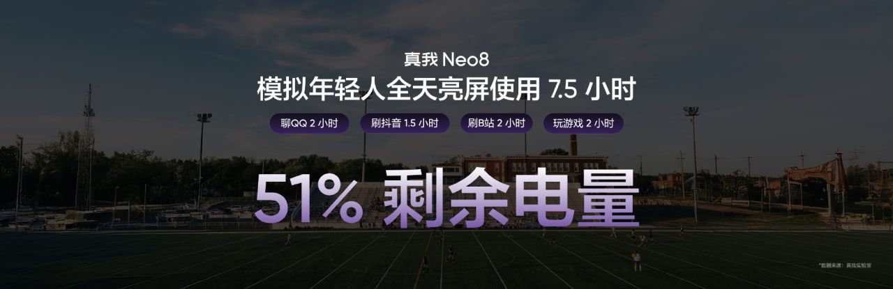 真我 Neo8搭载 8000mAh 大电池,含硅量提升至 16%,能量密度较上代再次提升 3%。模拟大学生全天亮屏使用 7.5 小时,剩余电量 51%。足够连续打 7.7 小时 MOBA 手游,刷超 20 小时短视频,并且支持全场景旁路充电,适配 UFCS、PPS、PD、QC 等多种主流快充协议。