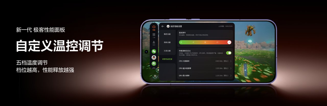 真我 Neo8搭载新一代 GT 性能引擎,支持先知能效调度、游戏专属性能核心、超级帧率算法,以及新一代极客性能面板,无需 ROOT,即可打破温控上限,可实现 5 档温控调节,档位越高,性能释放越强,以及自定义 CPU / GPU 频率。