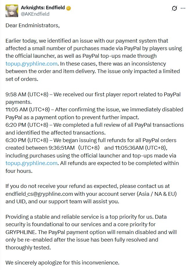 《明日方舟:终末地》公测首日大瓜,使用PayPal绑定支付后,会出现其他账户消费扣款的情况。