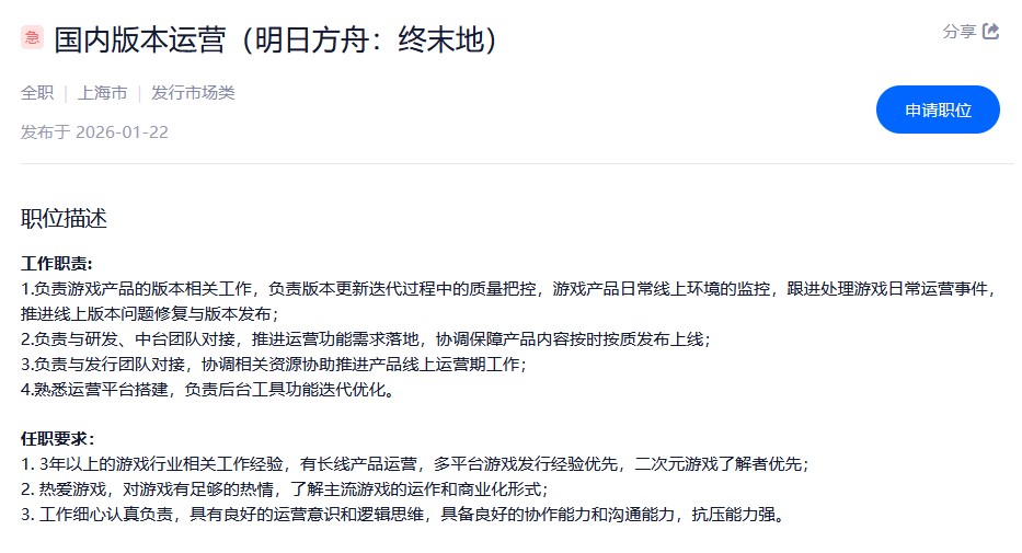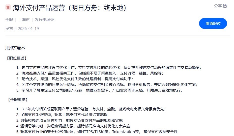 2026-01-19:海外支付产品运营(明日方舟:终末地)