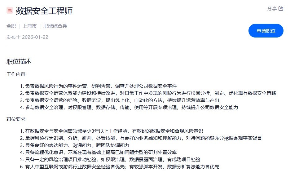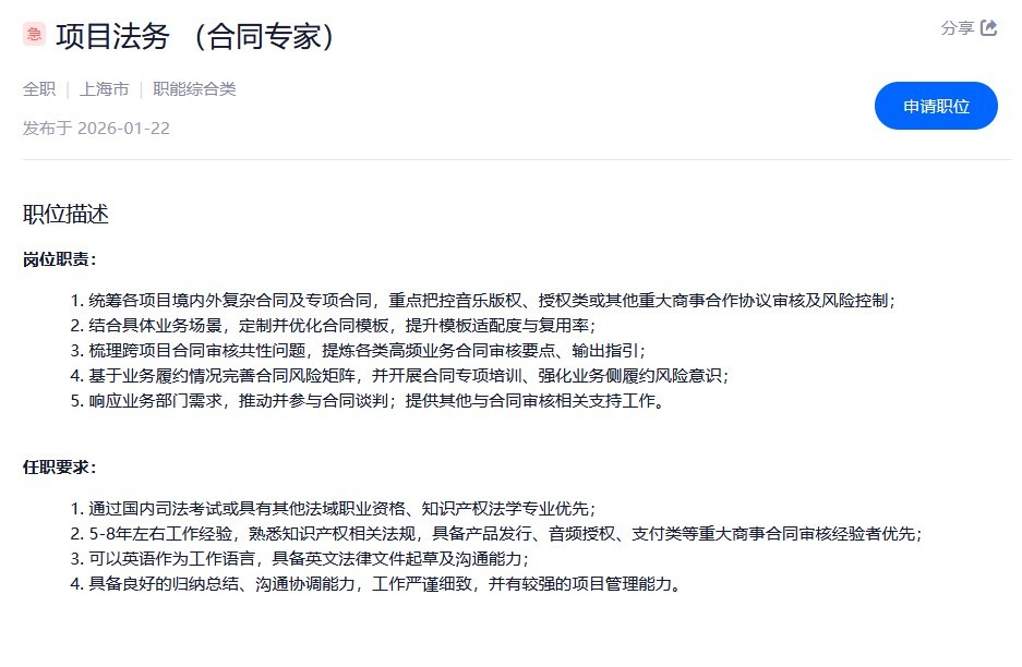 其中包含:项目法务 (合同专家)、数据安全工程师、国内版本运营(明日方舟:终末地)等岗位。