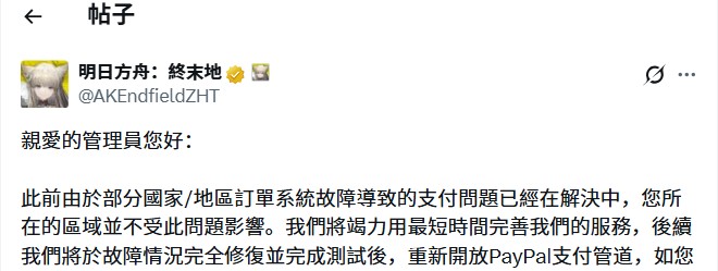 《明日方舟:终末地》外服事故(支付问题)