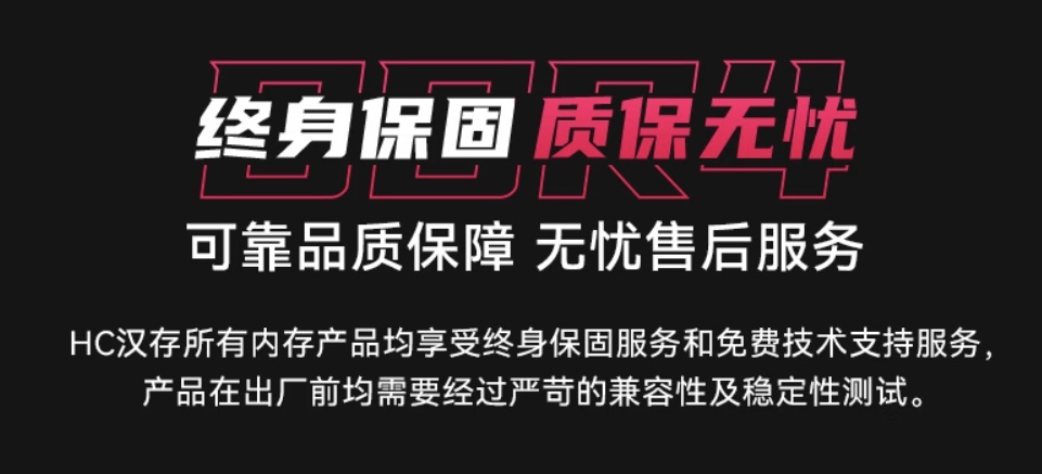 至于售后,售后都差不多,还是用汉存的例子,可以看到,跟其他家都一样,内存这东西也不容易坏全部是终身质保(同时还有技术支持服务)