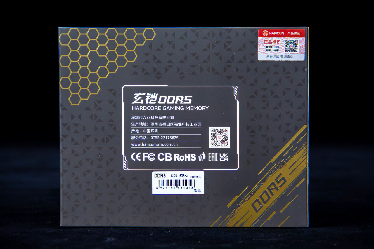背部印有玄铠、DDR5名称以及C28 16Gx2 黑色的信息