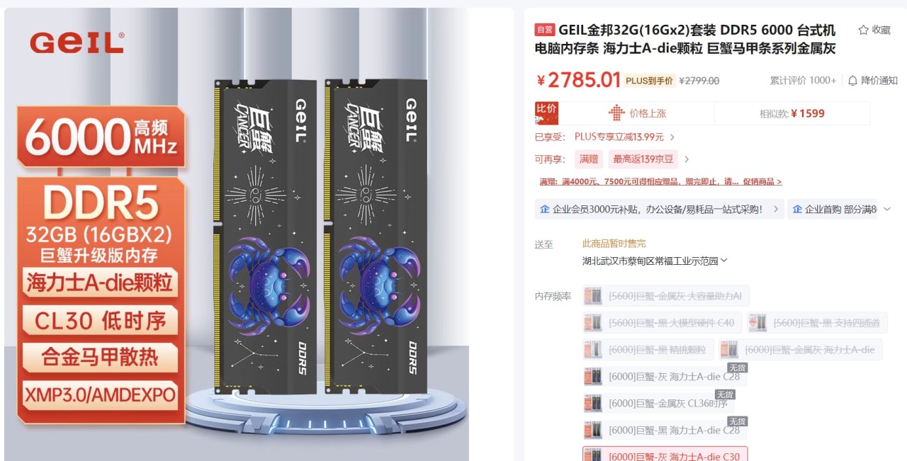 我随便看了一眼单根16G DDR5 6000内存,居然敢卖1500!32G套条更是直奔2700去了,这价格看得我头皮发麻,6000以下的机器几乎没得玩了。