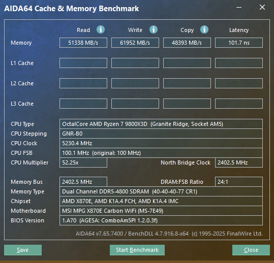 注意内存一定要开启EXPO,我的频率就只有4800mhz,可以看到延迟就来到了101ns。