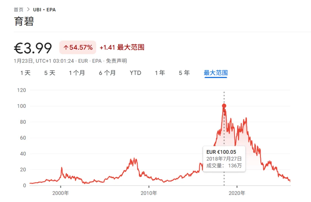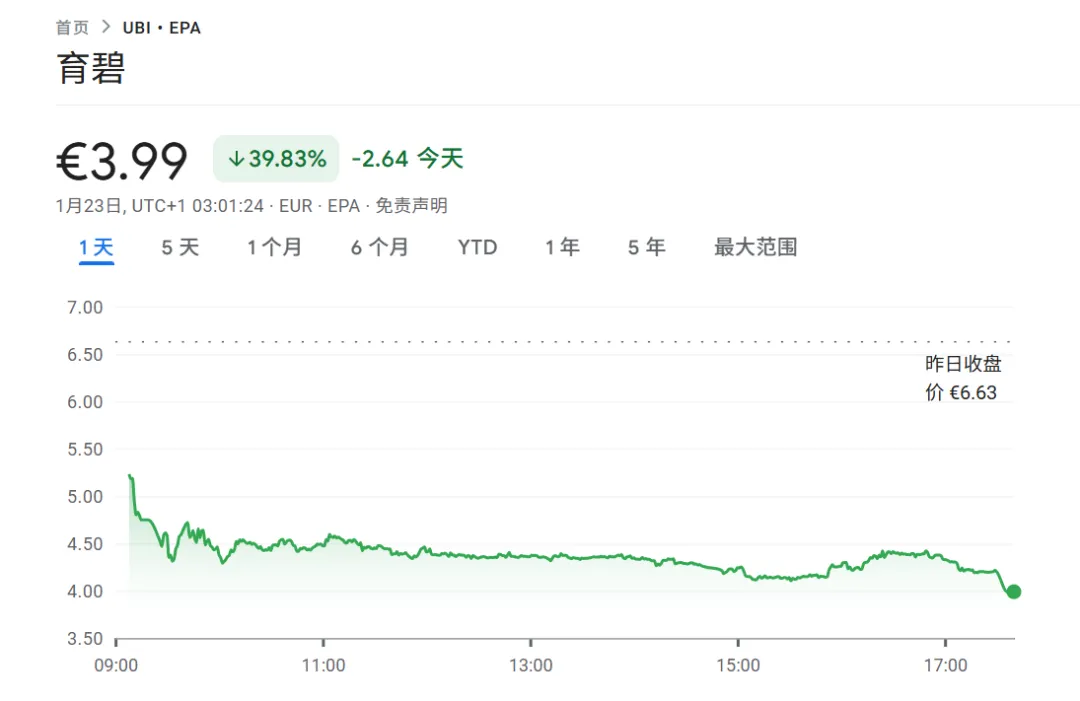 消息放出来当天,育碧股价直接跳水,盘中最大跌幅 34.37%,创下历史纪录。