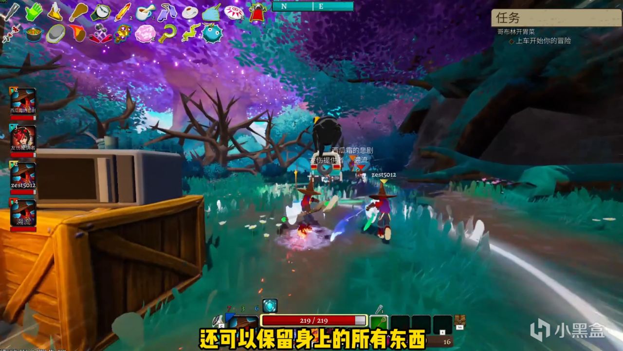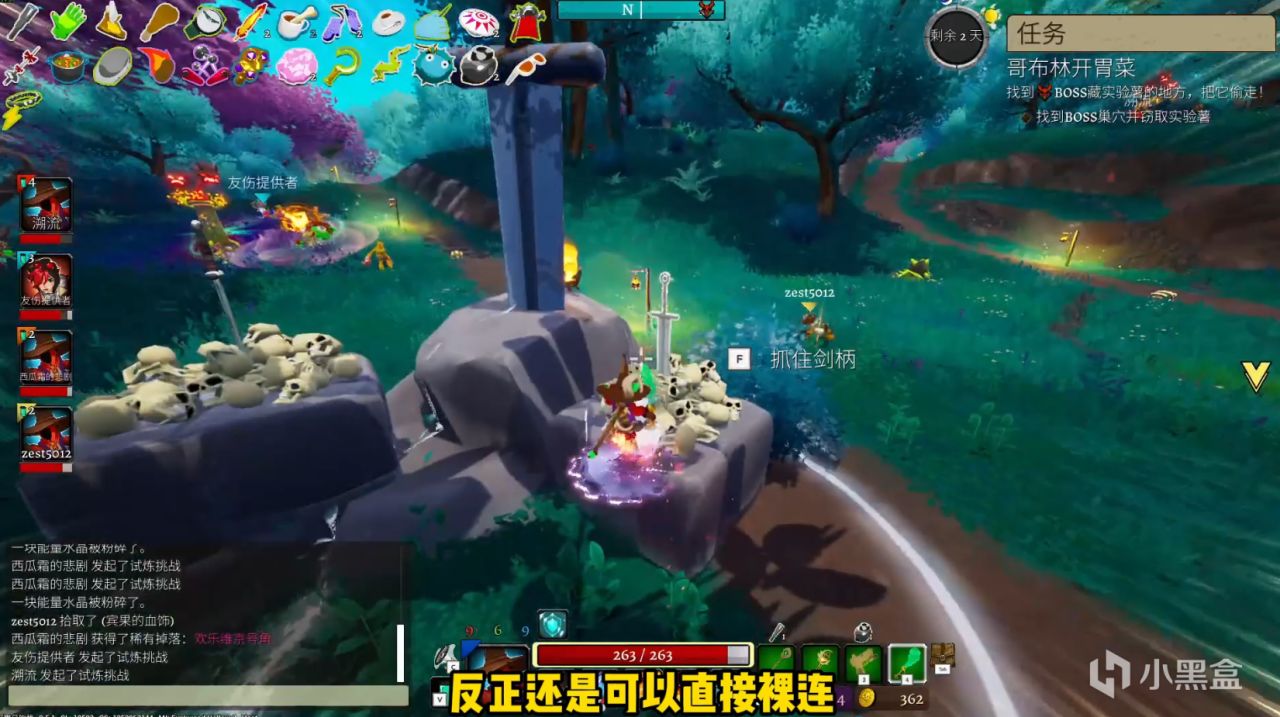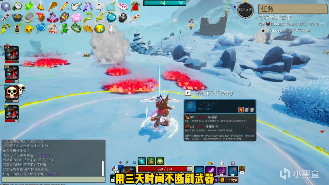 那这游戏最大的特点就是在《雨中冒险2》的基础上又融合了一些《艾尔登法环:黑夜君临》的玩法框架,就是也是要在一个个小型的开放世界地图里面用3天时间不断刷武器、叠加遗物还有属性点来强化自己,最后再打败BOSS回家。