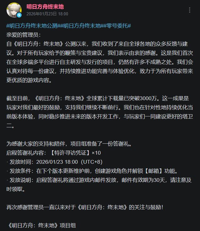 爲慶祝這一里程碑並感謝玩家的陪伴,項目組將於 2026 年 1 月 23 日 18:00 起,向符合條件的玩家發放【啓程答謝禮】,內含“特許尋訪憑證”×10。項目組表示,團隊在針對性優化當前版本的同時,穩步推進未來版本的開發工作,致力於與玩家共同建設更完善的遊戲世界。