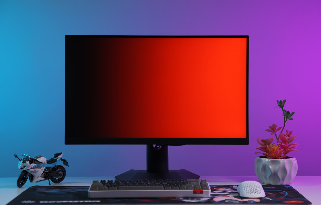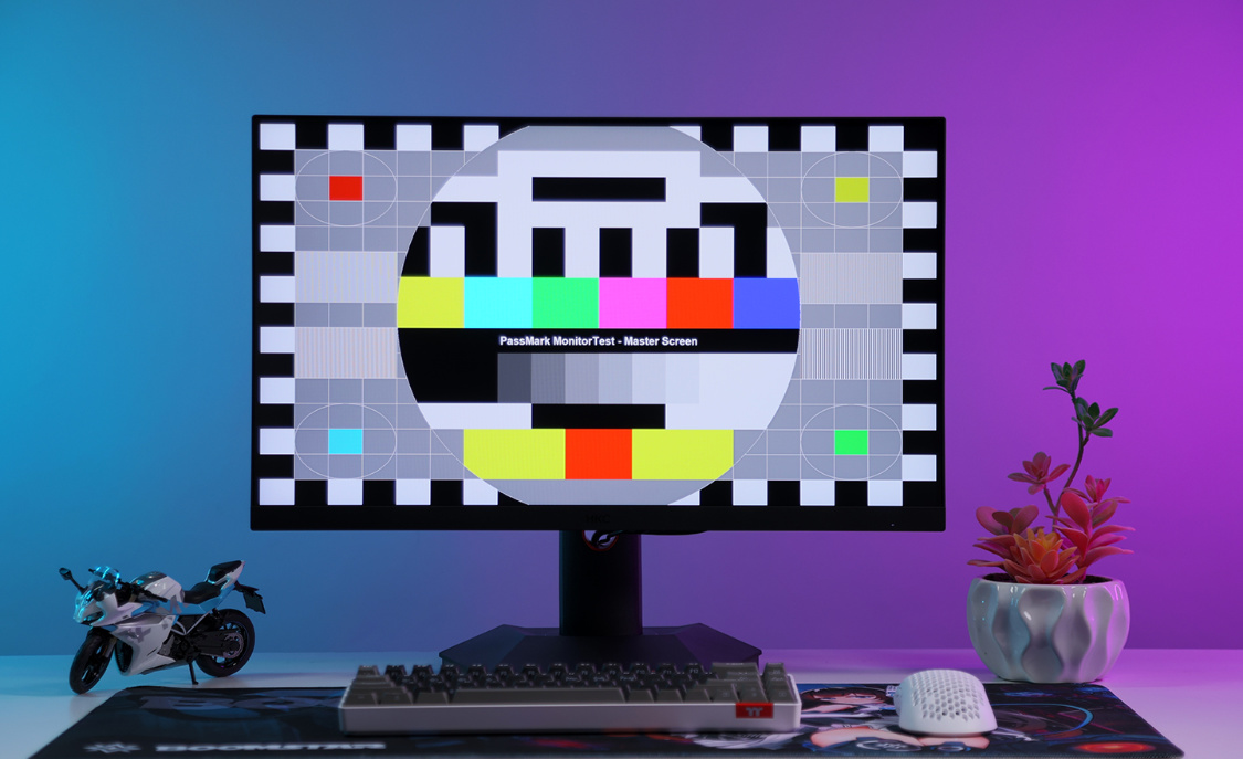 在多個不同顏色的純色背景下,可以排查屏幕是否有亮點、暗點、壞點的異常問題。在原廠背光模組的加持下,屏幕在純黑背景下也沒有出現漏光的問題,說明HKC出廠調教還是非常靠譜的;
