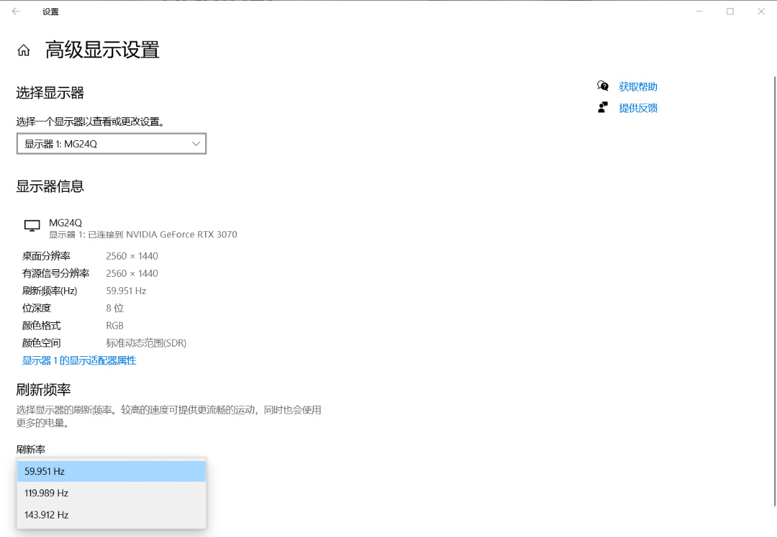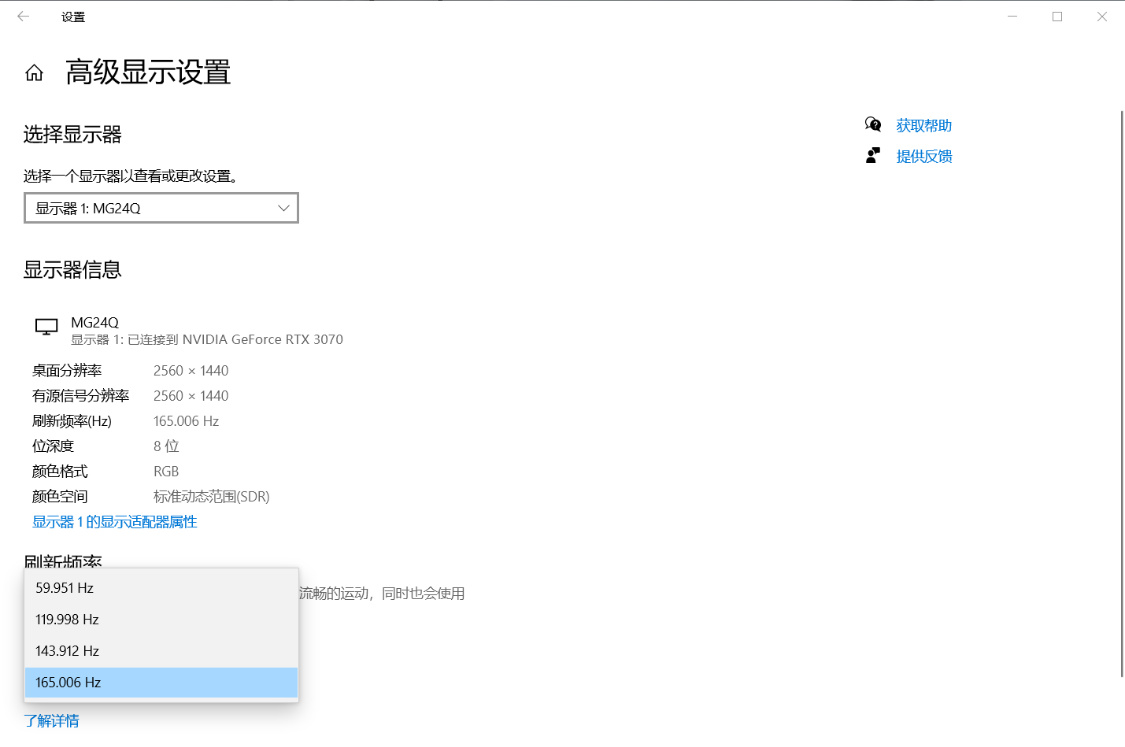顯示器刷新率設置,想要達到165Hz的刷新率,DP線必不可少。使用HDMI線,最高刷新率爲144Hz;