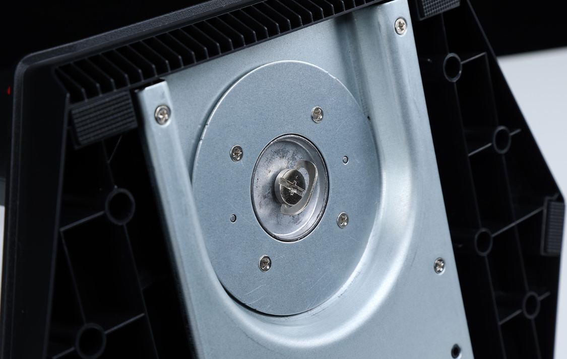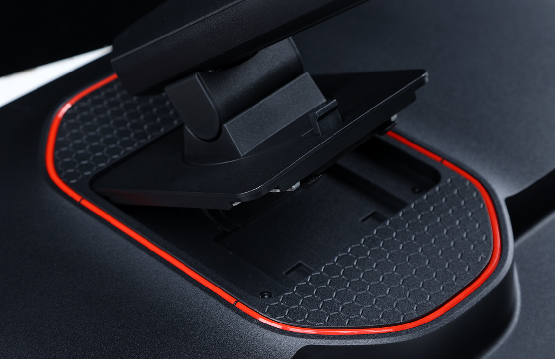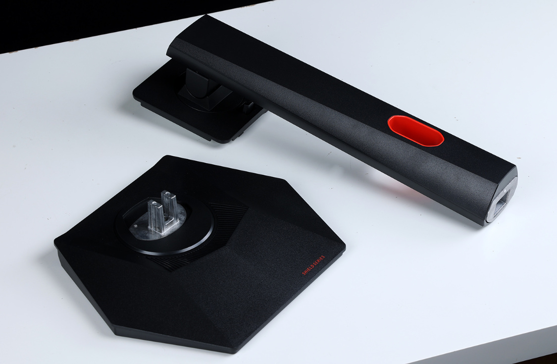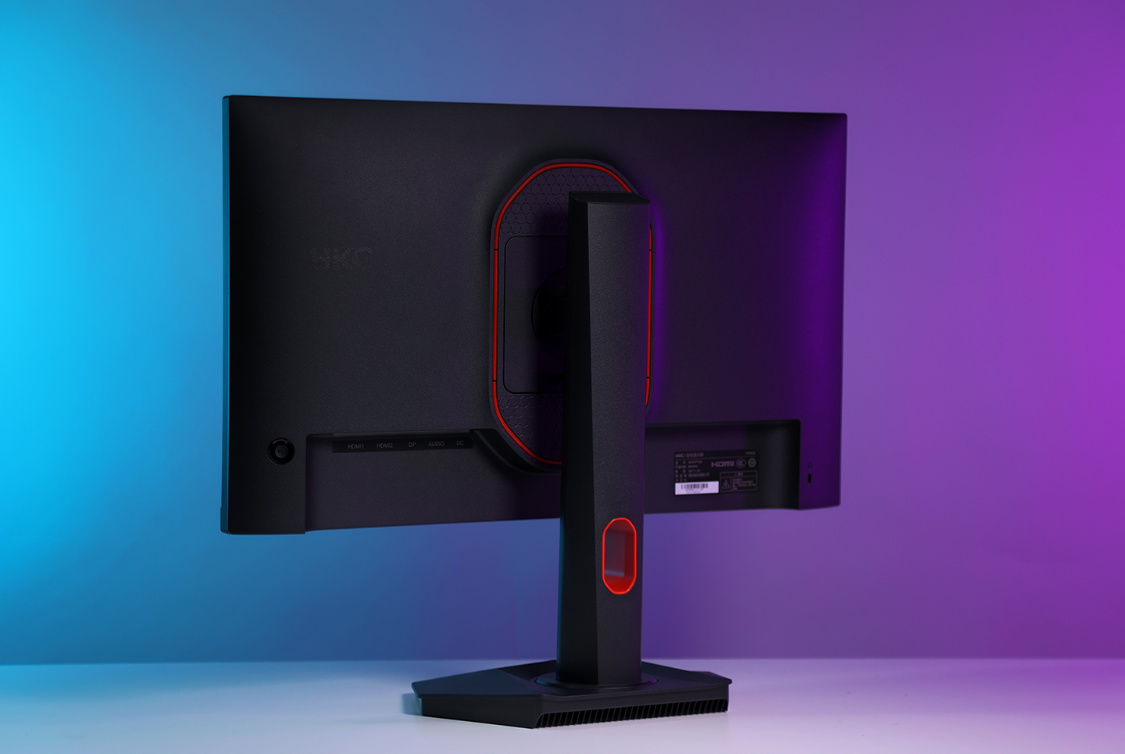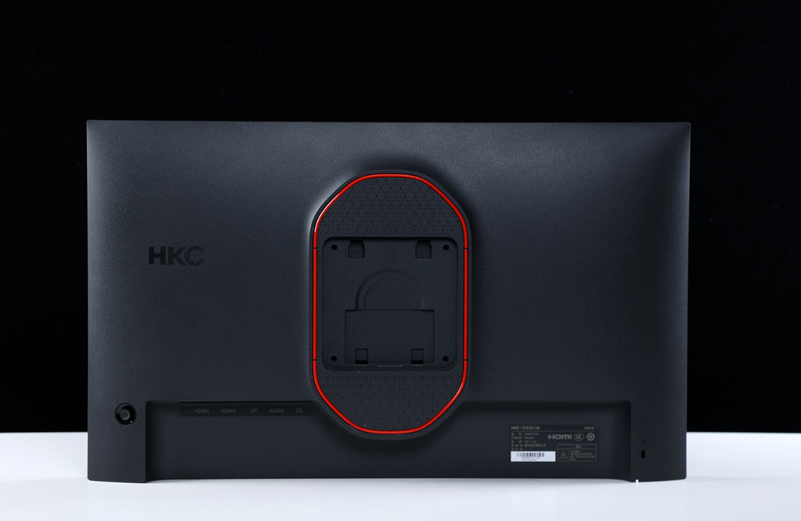 顯示器背部外形相對圓潤,帶有一定弧度。中間位置盾形凸起設計正好與產品“神盾”之名相契合。神盾正中間則是支架安裝卡口,除原配支架外還能支持壁掛支架安裝。外側一圈紅色裝飾,也並不是預想中的燈帶。