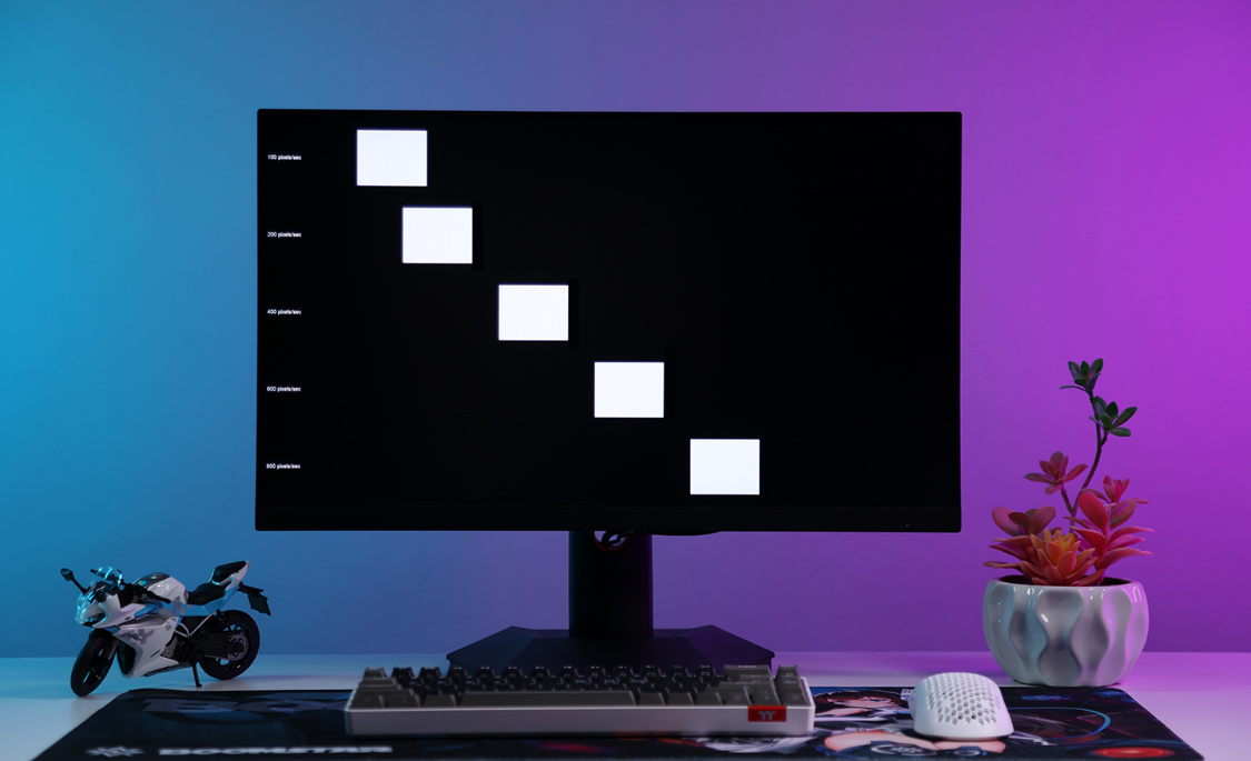 開啓顯示器高幀率模式,白塊追逐的測試畫面中,顯示器中也看不到有拖影現象。