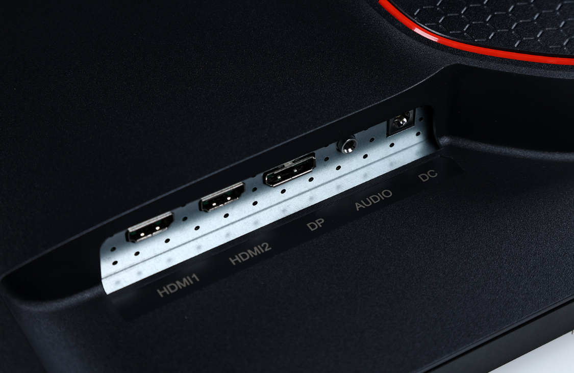 顯示器頂部和底部均有一些散熱格柵,I/O接口也位於底部一側。包含HDMI 2.0*2、DP 1.2*1、3.5mm音頻口*1、DC電源接口*1。