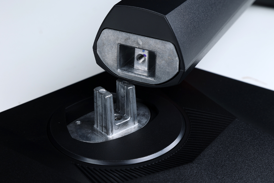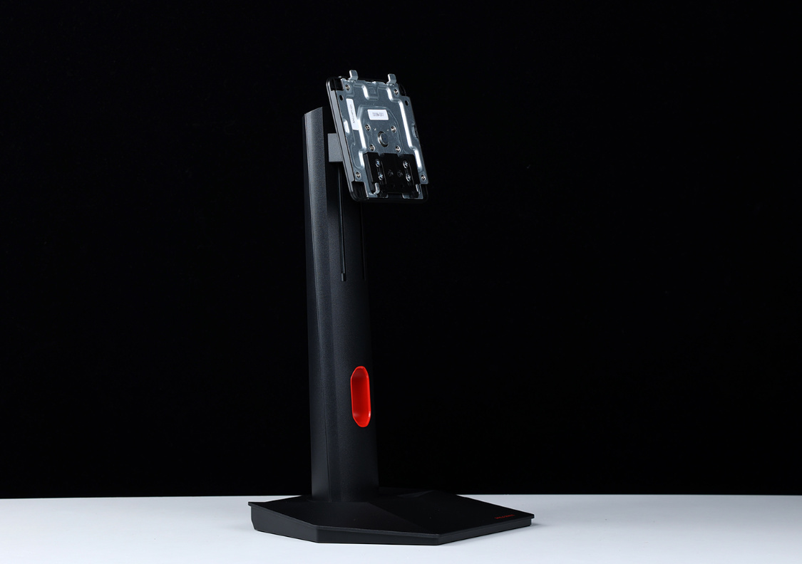 支架組裝也相當簡單,將支架底部的方形插孔對準底座上的金屬突起,然後擰緊底座下方的手擰螺絲,便大功告成。支架中間位置,還有一個非常搶眼的啞光紅配色理線孔(個人以爲多少有些騷氣)。