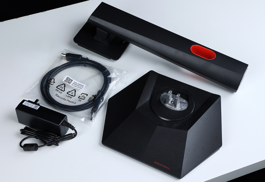 配件相對簡單:支架*1、底座*1、DP 1.2視頻線*1、電源適配器*1,再有就是說明書和保修卡。