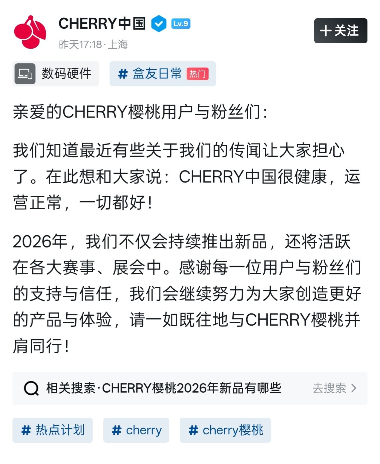最近看到一些網友說感覺CHERRY(櫻桃)品牌的鍵盤快要“不行了”,昨天,CHERRY在小黑盒的官方號發文說大家不要擔心。