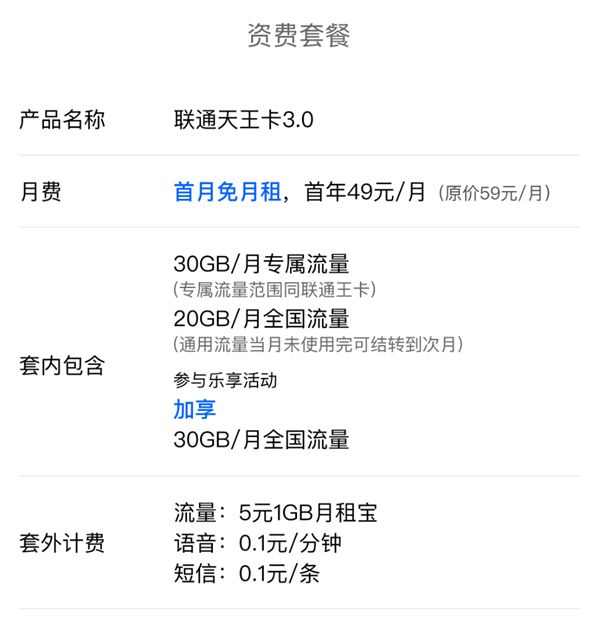 套餐內含80GB流量,其中30GB專屬+50GB通用,其中專屬流量範圍與聯通王卡一致。