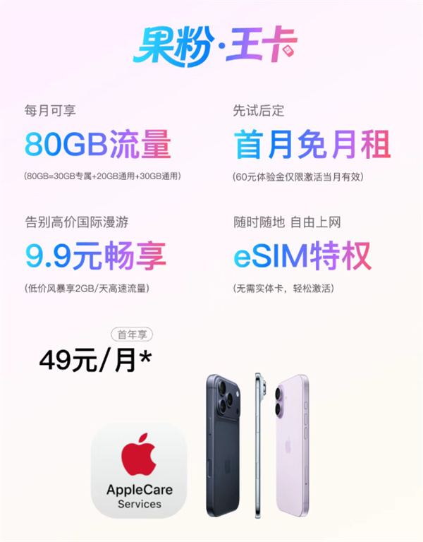 49元/月!中國聯通推出果粉王卡:80GB流量 送AppleCare