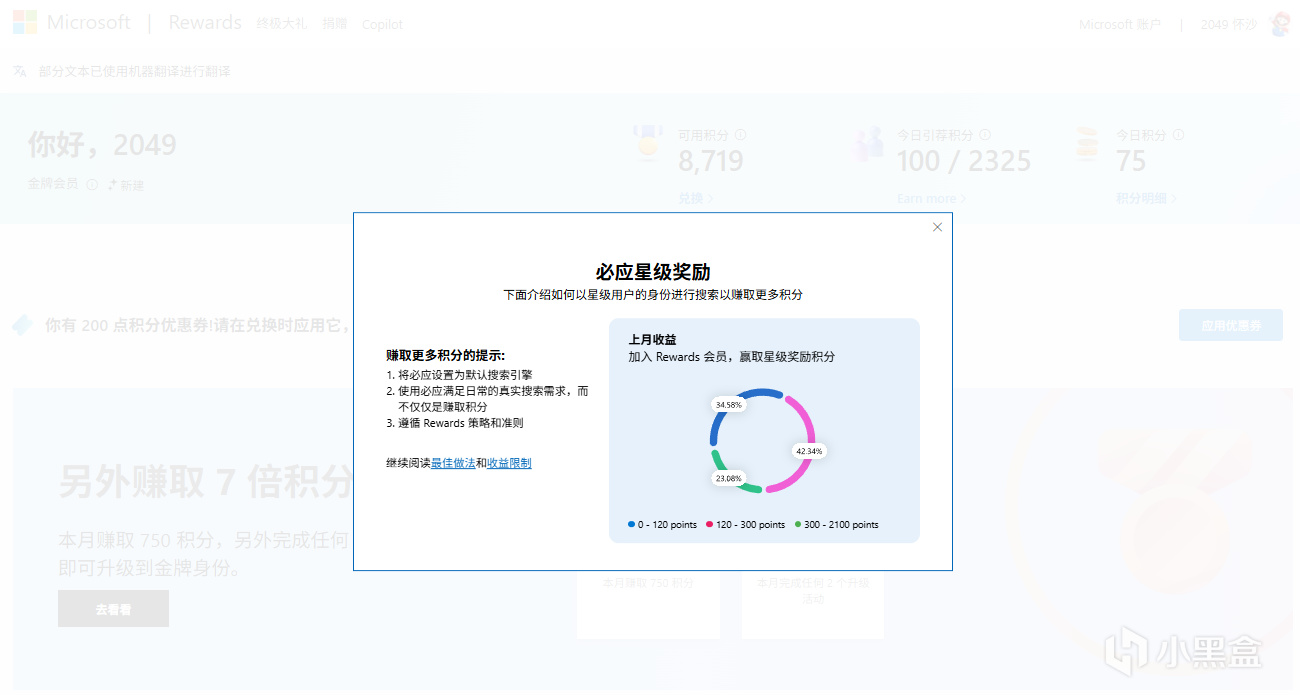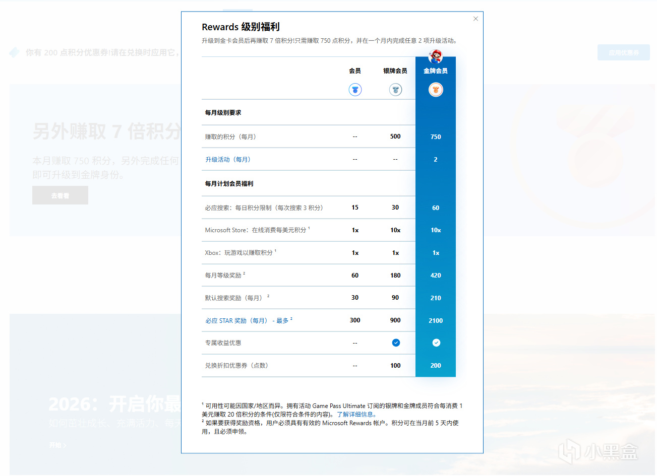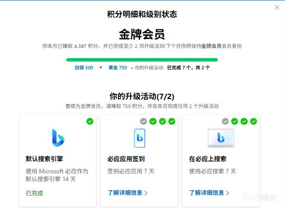 新版黄金会员(月度积分):每日(必应搜索60分+基础30分)×30天 + 月初奖励2730分 = 5430分。