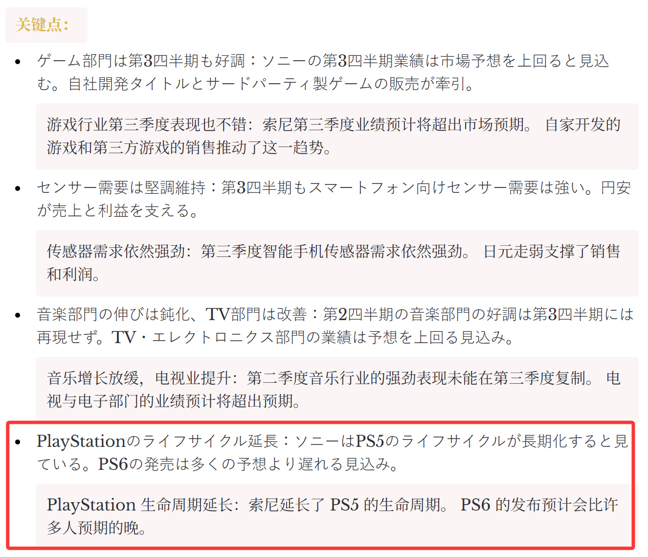 吉布森指出,索尼集团整体第三季度业绩可能超出市场预期,这主要得益于其游戏业务的持续强劲表现。公司自主开发的第一方作品与第三方游戏销售均表现优异。报告显示,索尼在假日季期间按计划实施了PS5折扣促销。游戏与网络服务部门第三季度营收预计达1.8万亿日元(约合人民币860亿元),营业利润有望达到约1600亿日元(约合人民币76亿元)。