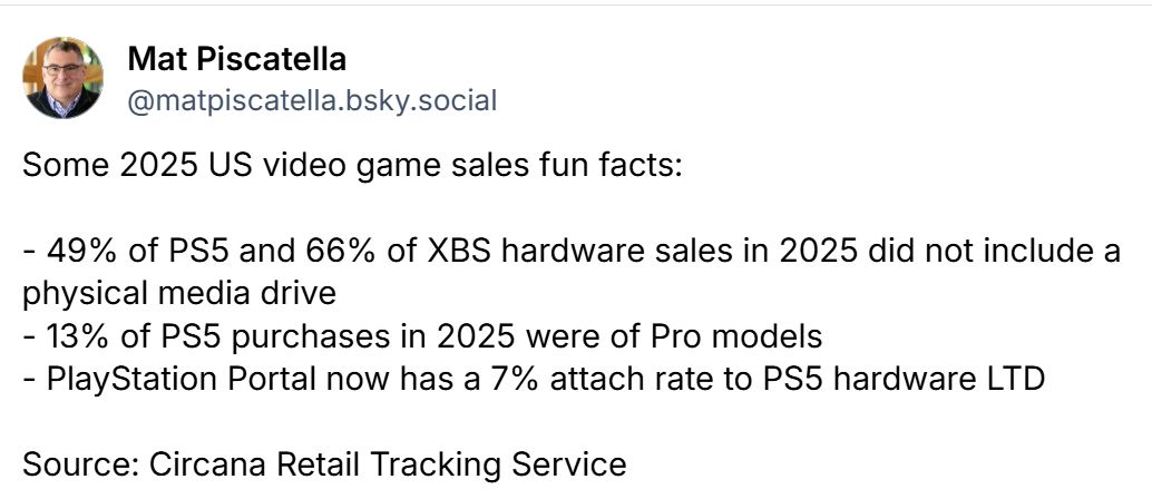 与此同时,Circana高级总监兼电子游戏行业顾问马特·皮斯卡特拉透露,2025年美国市场13%的PS5销量来自Pro机型,这表明其销售占比趋势与当年PS4 Pro在美国的终身销售比例基本吻合。
