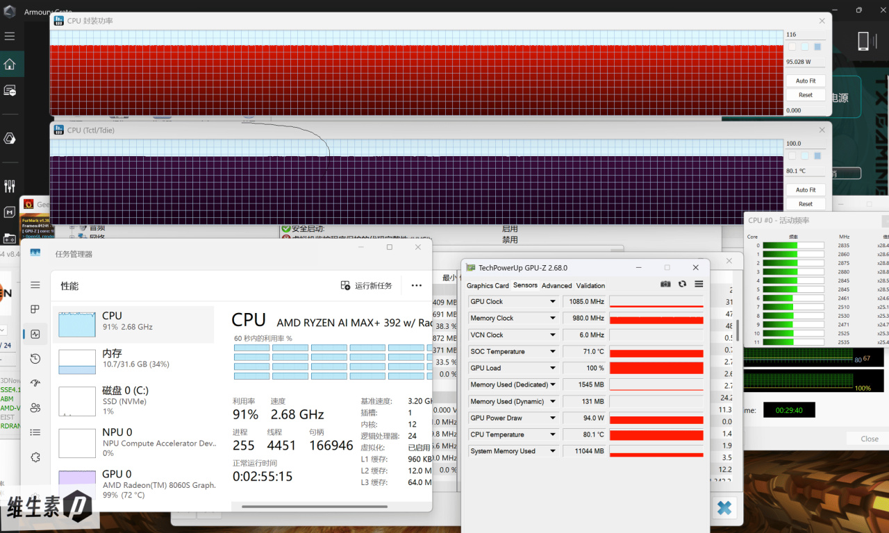 進入雙烤測試, 最後的結果也和單烤近似,手動模式總功耗最後穩定在 95 W ,CPU 頻率在 2.68 GHz 左右 , GPU 頻率在 1080 MHz 左右。
