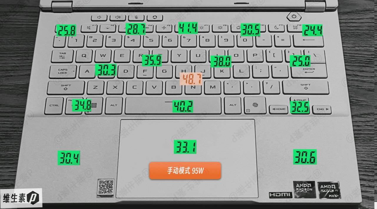 高負載雙烤 30 分鐘之後,使用紅外溫度計,測量鍵盤表面溫度,得到的數據如下圖所示。