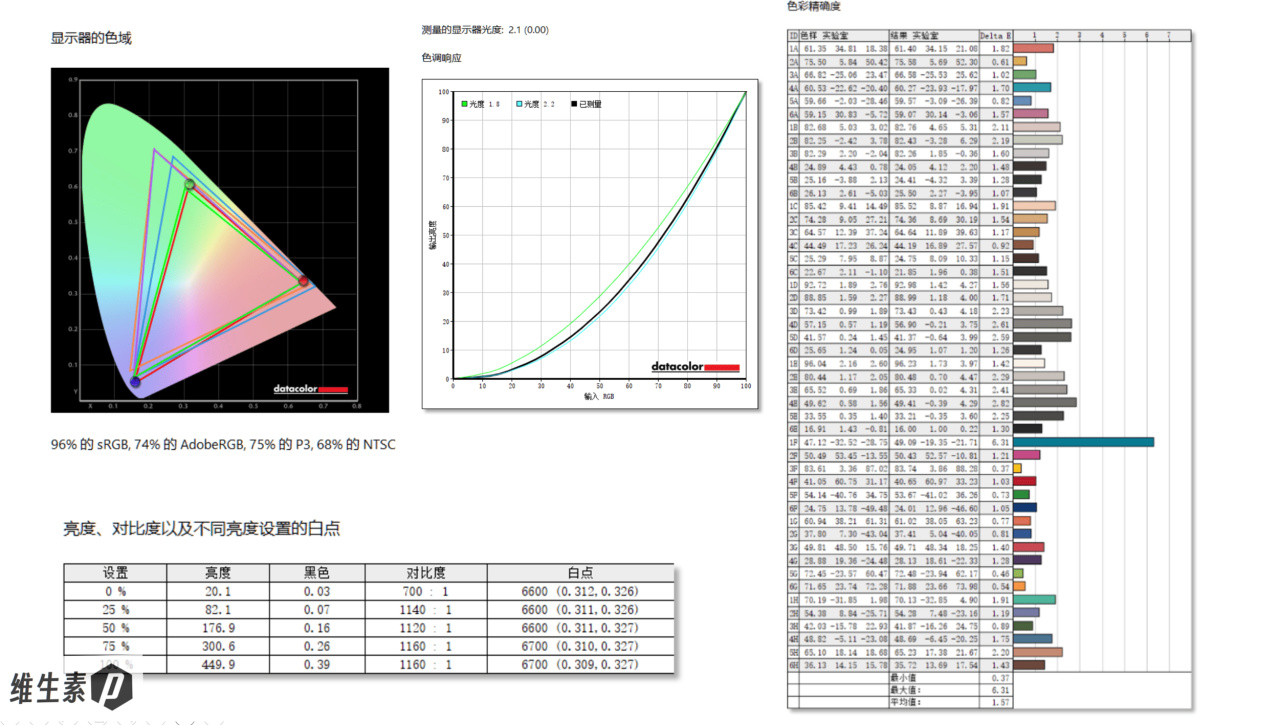 0% 狀態下亮度爲 20 nit,50% 亮度爲 177 nit, 100% 亮度爲 450 nit 。色調響應曲線爲 2.1,屏幕色準 Delta E 平均值爲 1.57。