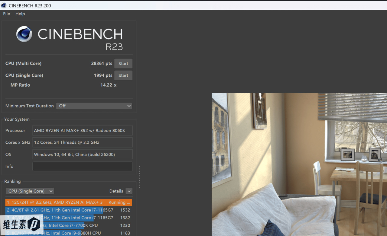 單輪 Cinebench R23 跑分如下:單核 1994 分,多核 28361 分。