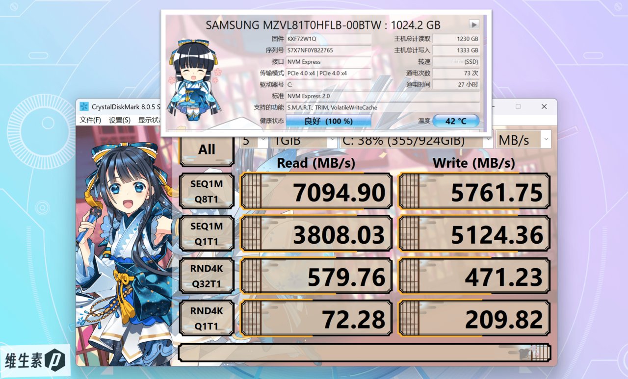 硬盤來自三星,型號爲 MZVL81T0HFLB-00BTW,容量 1T,PCIe 4.0*4 ,讀寫速度不錯。