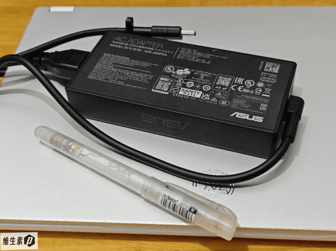 電源適配器一面印記是寫的 200W 輸出,支持 20V-10A,另一面貼紙上還多寫了一個 20V-12A 的 240W 輸出。經過測試,這臺機器的 C 口支持 PD 充電,20V 的小體積的氮化鎵充電器也可以使用,外出不開最強性能的話,可以更加便攜減重輕鬆。