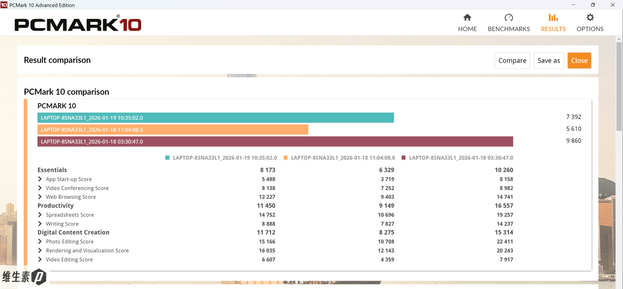 電源情況PCMARK 10 得分插電 手動模式9860 (100%)不插電 性能模式7392(75%)不插電 安靜模式-最佳能效5610(57%)