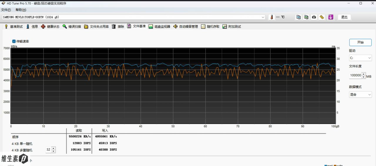 進行 HD Tune 100G 文件基準測試,跑100G的混合模式,表現如下,非常優秀。