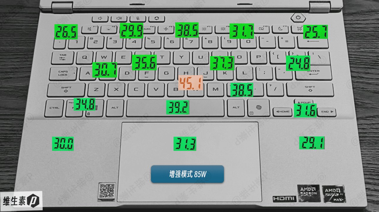 整體的表面溫度控制非常不錯,得益於鍵盤面進風設計,哪怕連續高負載半小時之後,雙手放置的區依舊冰冰涼涼。最高溫區域在空格鍵的右上方一點的位置,開增強模式情況下也 45 度,整體表現相當優秀。