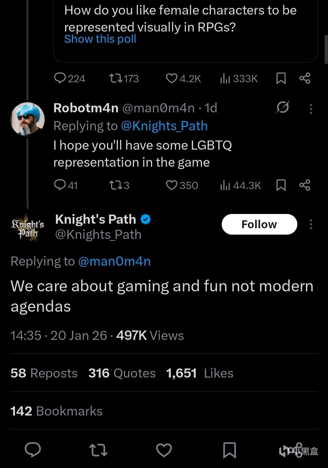 事件起因为官方在社交平台X上公布了女角色阿梅莉(Amelie),并表示她是游戏中可与玩家建立恋爱关系的女性角色之一。评论区有位玩家表示,希望游戏中能有一些LGBTQ群体的角色或形象。对此,官方回应道:“我们关注的是游戏和乐趣,而不是现代议程。”