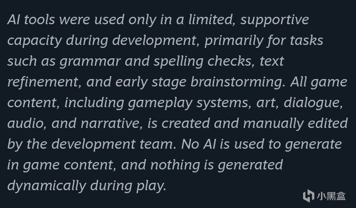 游戏的所有内容——包括玩法系统、美术、对白、音频和叙事——均由开发团队亲自创作并手动编辑完成。没有任何AI被用于生成游戏内内容,游戏过程中也不存在动态生成的内容。”