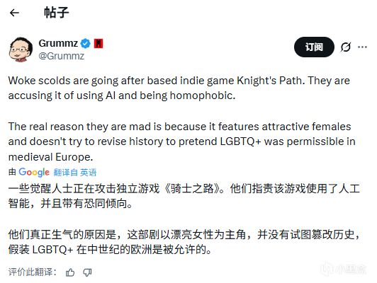 据海外知名游戏博主@Grummz解释道,此举引发了部分特殊人群的不满。“觉醒派”道德警察正在针对《骑士之路》发起攻击,指控该作使用了AI,并且带有恐同倾向。