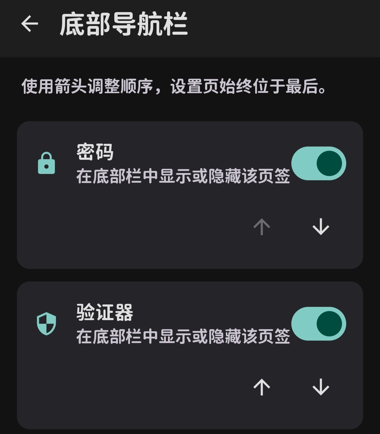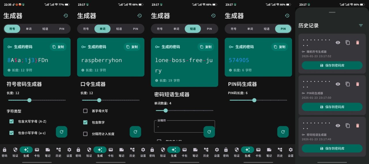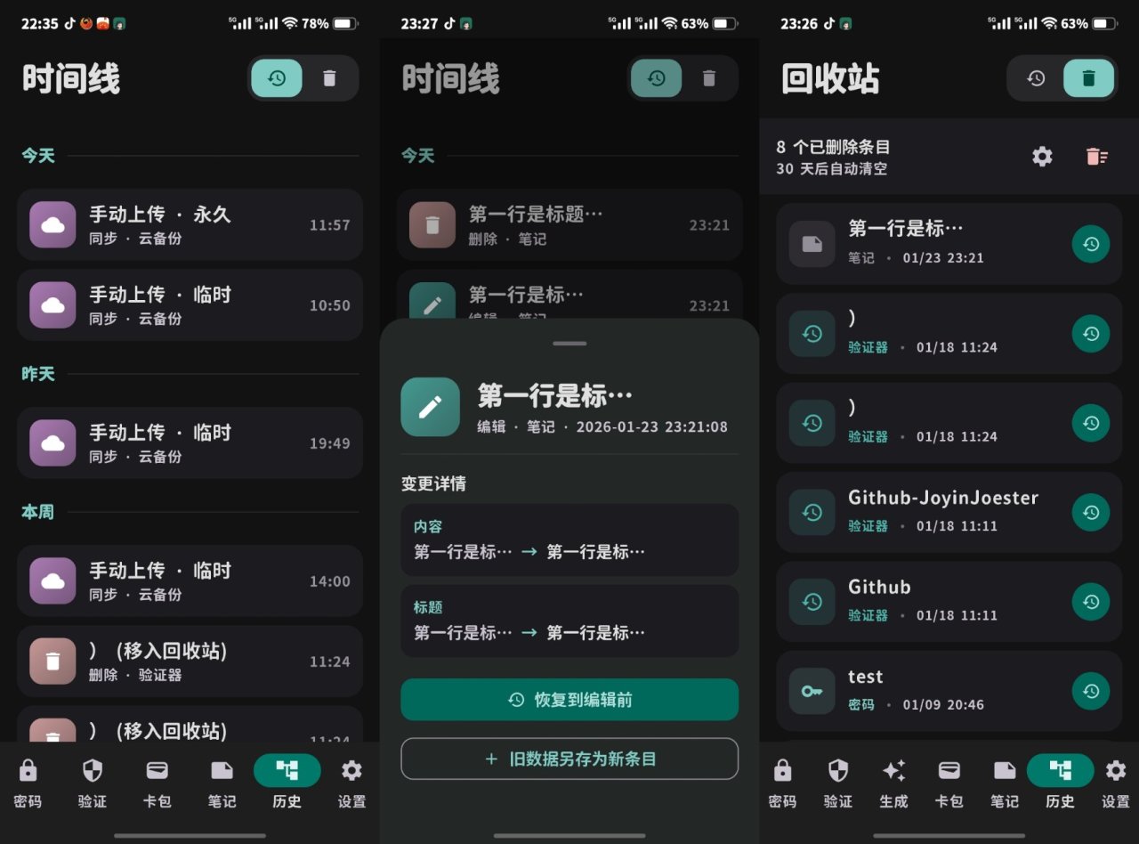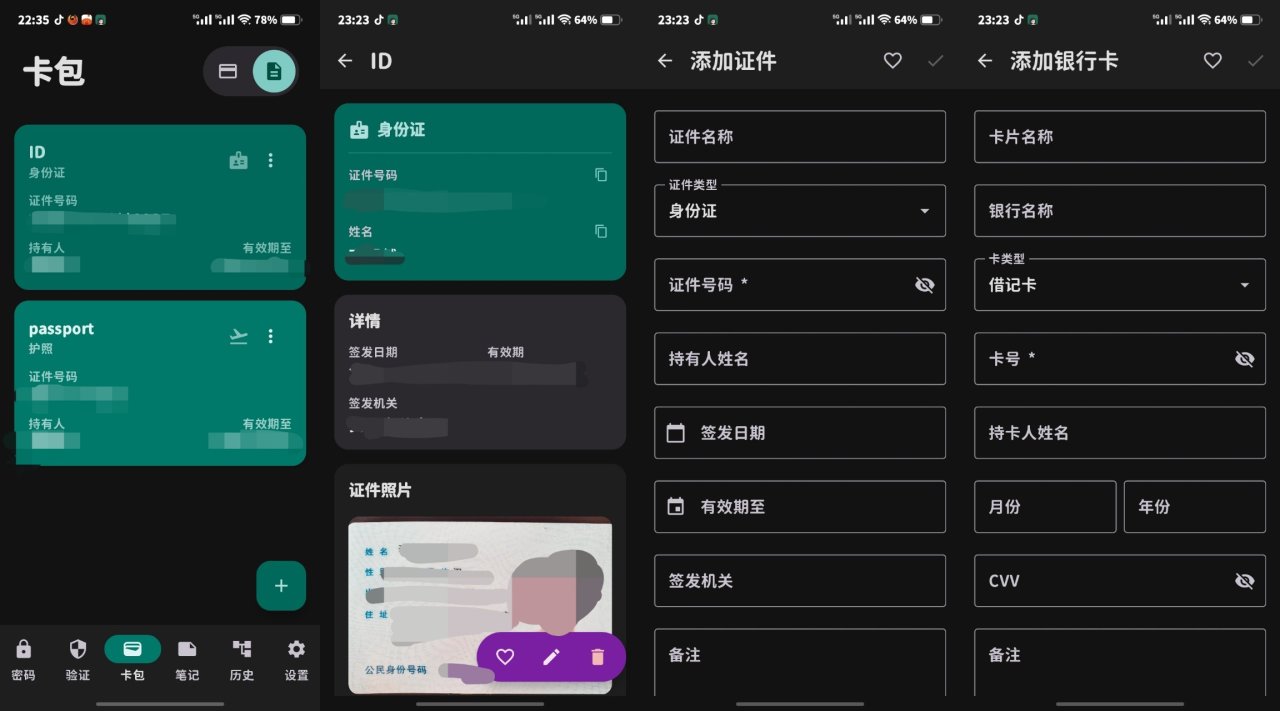 分别是,密码管理器,2fa验证器,卡包,安全笔记,时间线/回收站,密码生成器,设置页面