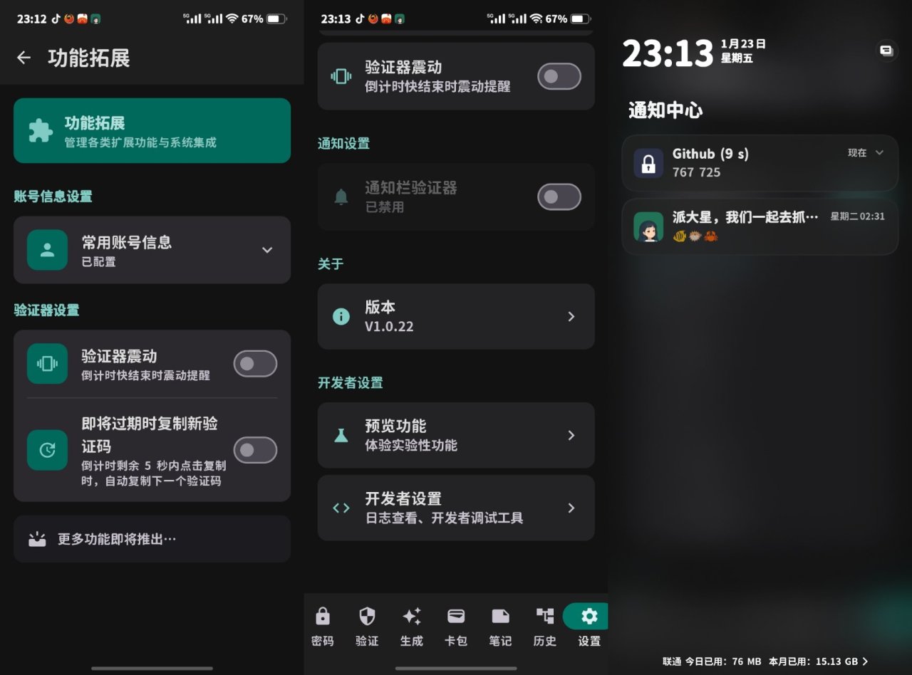 也可以去设置页面功能拓展里面打开“即将过期时复制新验证码”这样在倒计时5秒的时候点击卡片复制的就是下一个验证码了,也可以开启验证器震动,也是倒计时5s的时候会随着秒数震动,通知设置开启通知栏验证器,会在通知栏常显示已选的验证器(这个功能也属于功能拓展忘记移进去了)