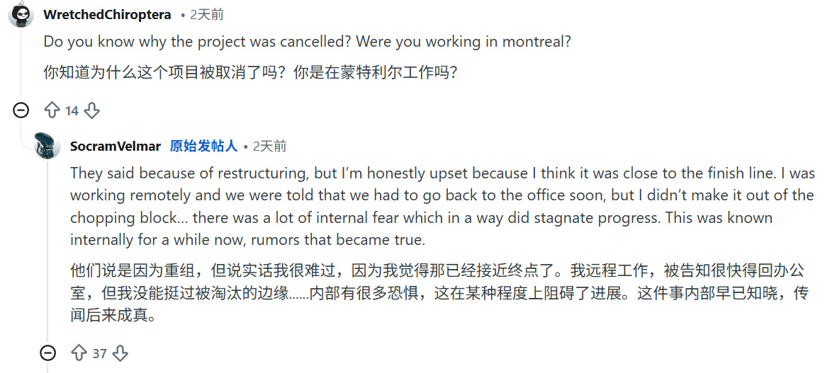 "官方说法是结构调整,但我个人感到沮丧,因为项目明明接近完工了。"其写道,"我当时远程办公,公司通知即将恢复办公室工作,但最终我没能躲过裁员……内部弥漫的恐慌情绪确实在某种程度上阻碍了开发进度。其实相关传言在内部已流传一段时间,如今只是被证实了。"